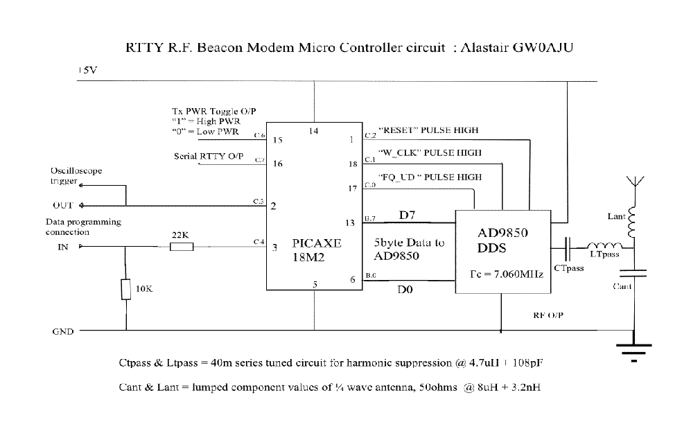 The above circuit diagram is one of a “PICAXE RTTY QRP Beacon”. The micro-controller is a “18M2” PICAXE device from the online store “www.picaxe.com”, and further supplies can be found from their online attached store “tech supplies”.