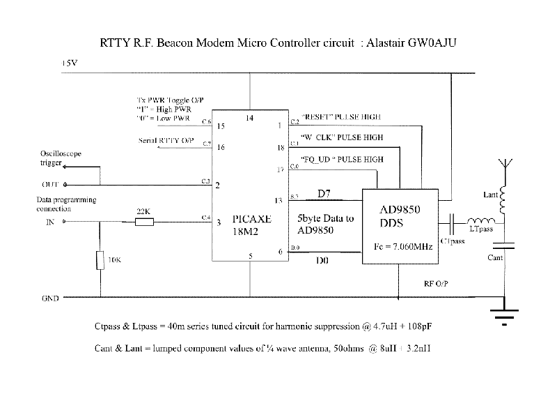 The PICAXE program supplied as a downloadable link, generates the output transmitter frequency on 40meters, more precisely actually on centre carrier frequency of 7·060MHz. For the logic zero space tone the carrier output generated is 7·061275MHz, while for the logic one mark tone, the generated output frequency is 7·061445MHz. To alter the centre carrier frequency, use the “Analog Devices url link” to generate the 5 Byte numbers required to reposition each of bit logic tone carrier frequencies individually required, whatever the FSK frequency shift pattern. In addition, pin 15 (c.6) of the 18M2 device, will logic switch between each resending of the RTTY message. The idea is to alter the transmitter power by ½ and then by 2, hence by 3dB in power, or by 6dBV, swinging the “S meter” of the receiver between an “S point” reading, say between S5 and S6. This will in turn calibrate the “S Meter” on the monitoring radio receiver.
